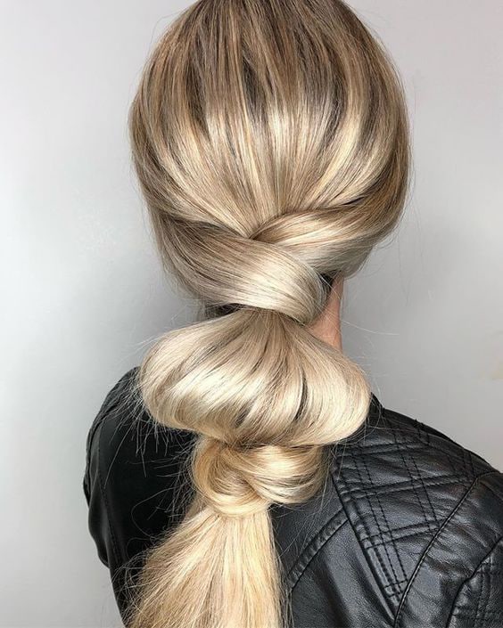 Aveda Artist Sarah Naslund created this gorgeous, full pony for holiday parties, and it’s super easy to achieve at home. Prep your hair with Dry Remedy Daily Moisturizing Oil or Light Elements Smoothing Fluid. Section your hair into three sections and secure the middle section with an elastic. Wrap the side sections around your middle section, then join them underneath with an elastic. Divide that pony into three sections and repeat the process again, then finish with Brilliant hair spray for shine and hold.
