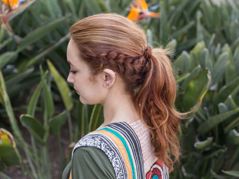 3. Create two dutch braids (an inside out French braid) on both sides of the part. Keep braiding so that the two French braids come together to form one regular three-strand braid down the back of the head. Gather ends into an elastic.