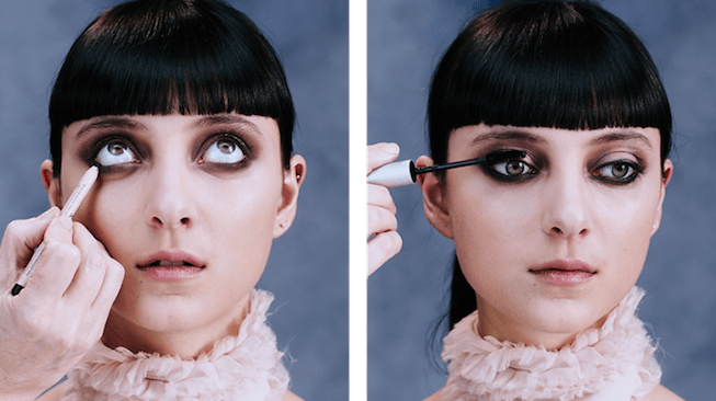 7 Encircle the eyes with Petal Essence™ Eye Definer in Black Orchid, winging out slightly at the outer corners of the top lash lines, and diffuse with the Eye Smudger Brush. Apply the same shade along the inner rims of the eyes.
