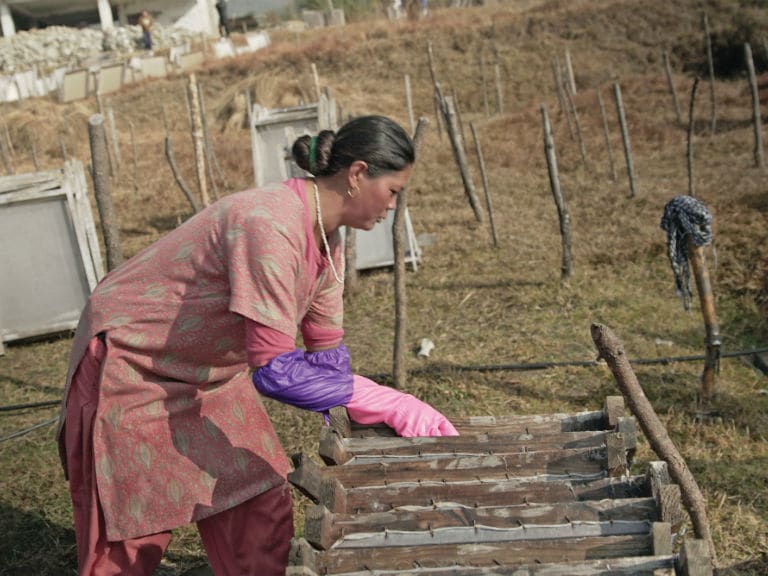 OUR CONNECTION TO NEPAL FIRST BEGAN THROUGH OUR PURCHASE OF THEIR LOKTA BARK PAPER FOR OUR HOLIDAY GIFTS SETS. DOMA (SEEN HERE) HAS BEEN A NEPALI PAPERMAKER FOR AVEDA FOR MORE THAN 12 YEARS. HER WORK CONTINUED AFTER THE EARTHQUAKES IMPACTED SO MANY LIVELIHOODS—SO HER SONS CAN GO TO SCHOOL. SHE’S PROUD OF BEING ABLE TO PROVIDE AN EQUAL CONTRIBUTION TO HER HOUSEHOLD.