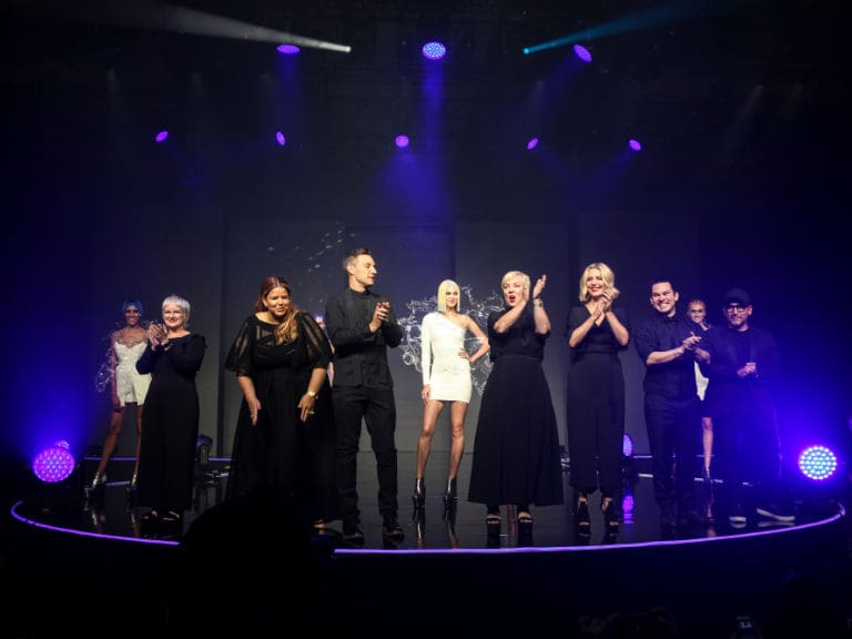 The artistic tribute featured models in distinct hair styles that appeared liquid-like when they walked the runway wearing dresses of acrylic that evoked the look of splashes. Eco glitter, sequins and recycled crystals adorned intricate hair styles that included finger waves and geometric cuts colored in vivid hues by Ian Michael Black, Global Artistic Director, Hair Color.