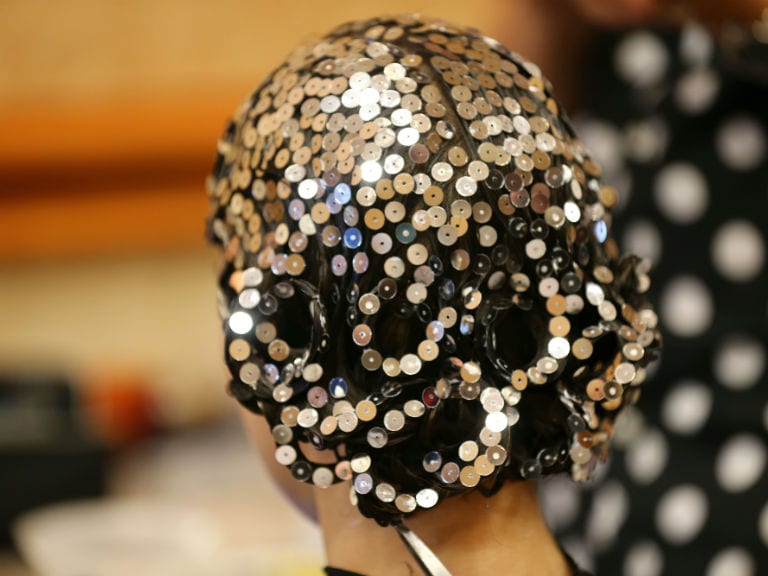 A sleek blonde with tips encrusted in recycled crystals. “The blonde crystal wefts were used very long ago in a show I did overseas and today I am able to give them a new artistic life,” said Antoinette.